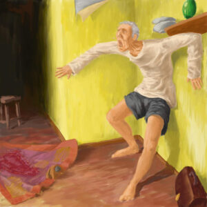 Пил неделю. Жена не вызывала врача — “всегда сам отходил”. На 3-й день трезвости начались странности: слышал шаги, шептал, не спал. Утром выбежал на улицу в трусах, кричал, что “за ним охотятся”.